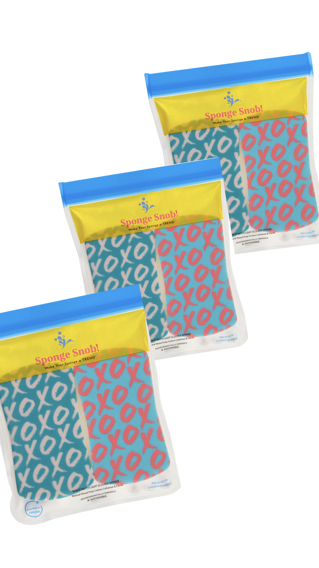 Our sponges are durable, ergonomic shaped, printed with non toxic, unique designs to brighten up your kitchen and are packaged in a reusable food grade safe pouch. With our future in mind our aim is to Reduce, Reuse and Recycle and this starts by eliminating single use plastic packaging.